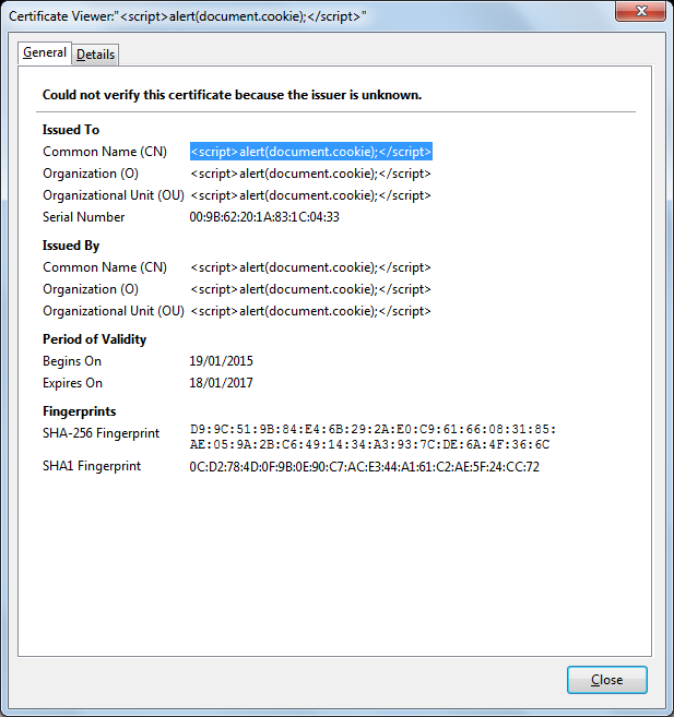 Common Name (CN) 'ine bir XSS payloadu yerleştirdiği sertifikayı test için web arayüzünden yükleyen araştırmacı, sertifika bilgileri ekrana basılır basılmaz XSS payloadunun çalıştığını görüyor: